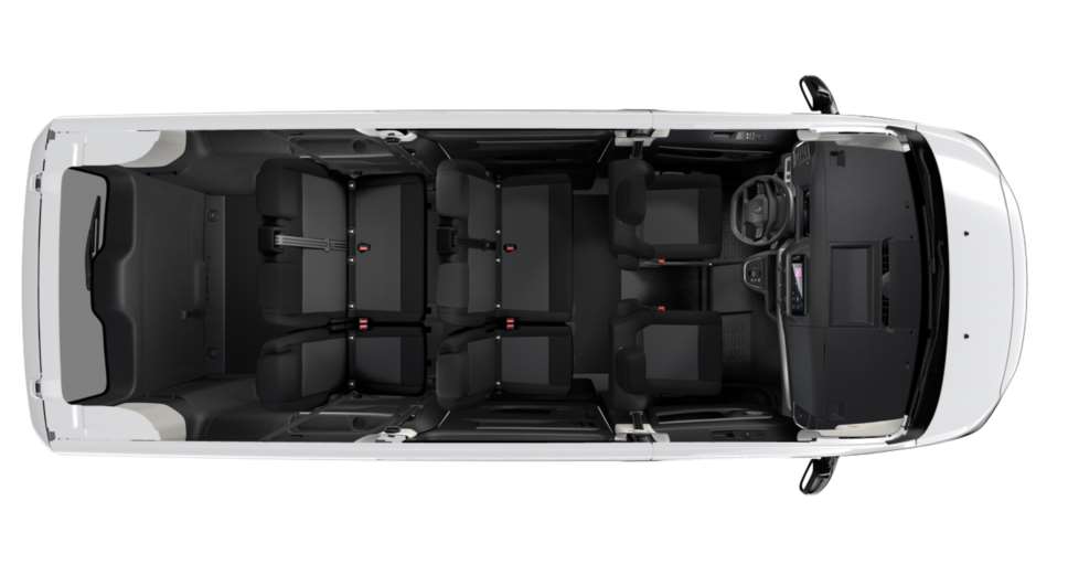 Reihe 1: Fahrersitz mit Armlehne, in Höhe, Länge und Lehnenneiung manuell einstellbar, sowie Doppelbeifahrersitz mit Ablagefach unter dem Sitz